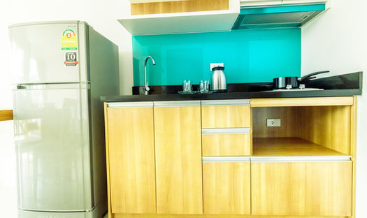 Basic kitchen utensils: frying pan, sauce pan, kettle, cutlery, plates, glasses and coffee cups